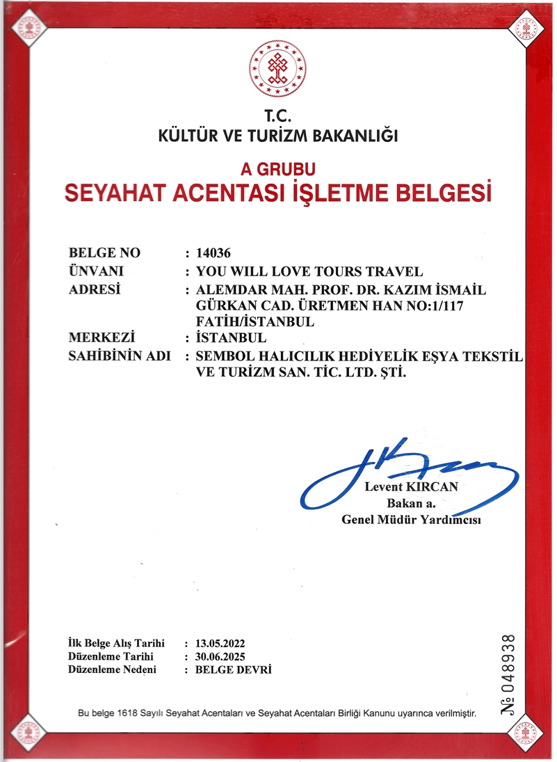 At You Will Love Tours Travel, your safety and satisfaction are our top priorities. Our company is an official member of the Association of Turkish Travel Agencies (TÜRSAB), under the Ministry of Culture and Tourism of the Republic of Turkey.